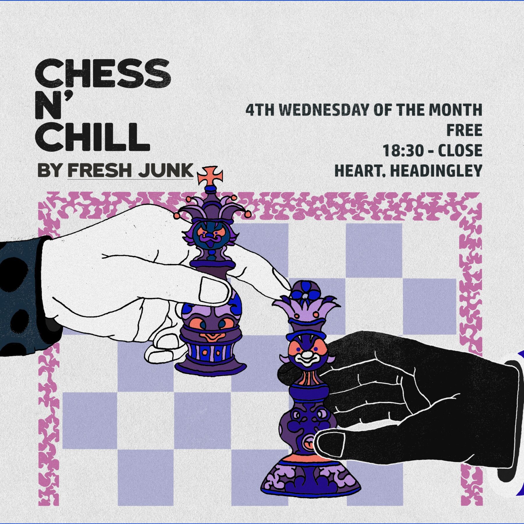 Hey folk :^) We're excited to welcome you to our monthly chess club at Heart! Come and play some chess whilst we